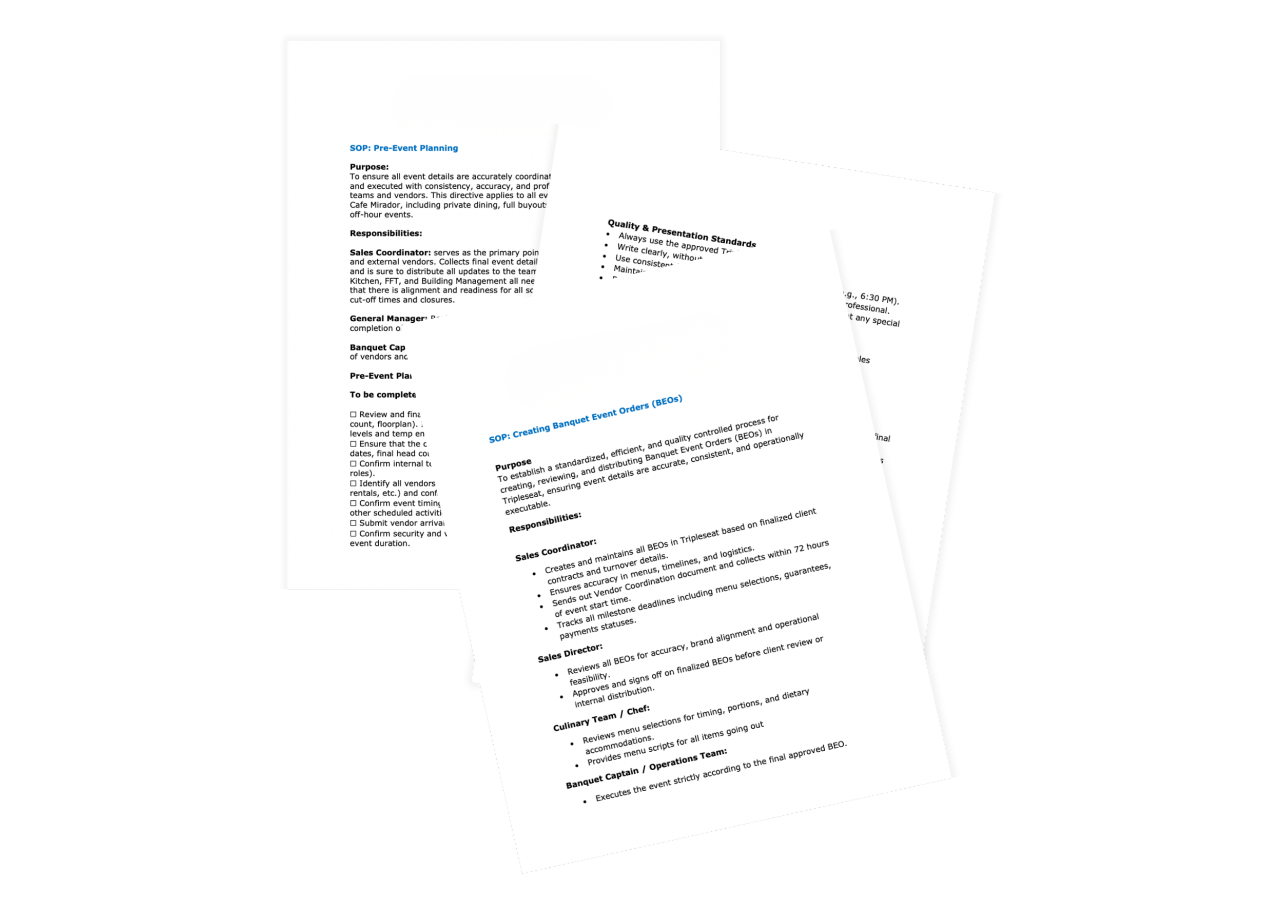I designed two standard operating procedures to formalize that coordination: a Pre-Event Planning SOP and a BEO Creation process in Tripleseat. Together they define who owns what, when it happens, and what to do when something changes.